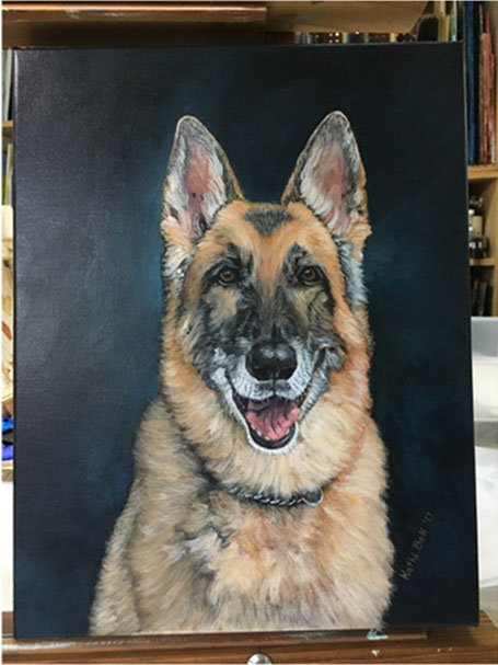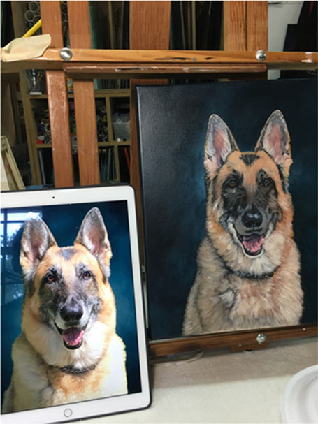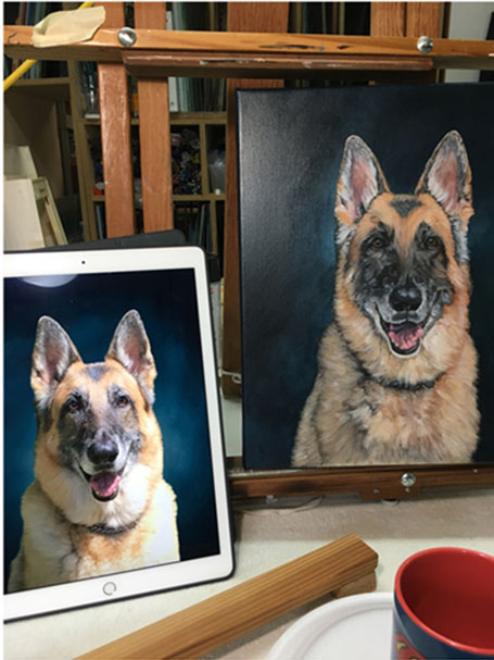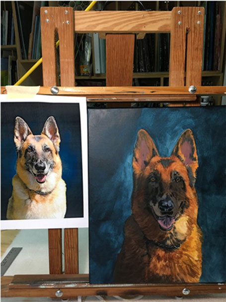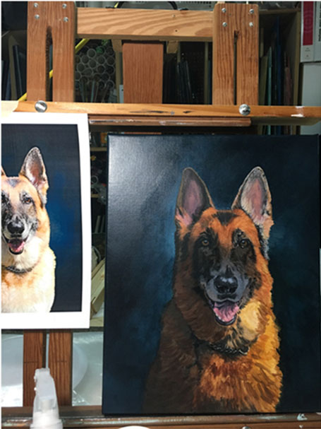 Below is a brief overview of how a painting proceeds, from the preliminary underpainting (with the darker tones and placement of details) to the addition of highlights and final details in the finished painting.